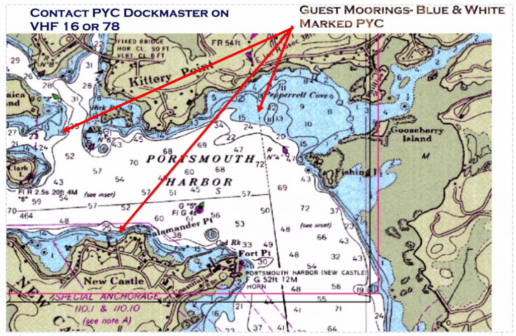 We maintain guest moorings in front of our docks and in Pepperell Cove diagonally across the harbor in Maine. Please refer to the chart shown below for orientation and notional location of the mooring fields. PYC club and launch use are included in the guest mooring fee.